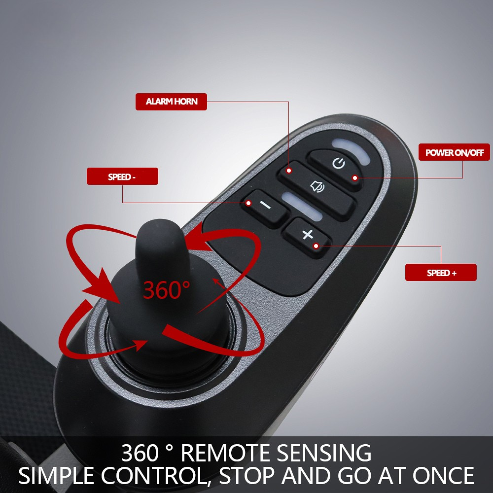 Smart Joystick Control: Simple, one-hand joystick for direction, speed adjustment (0–6 km/h, 5 gears), and battery check.