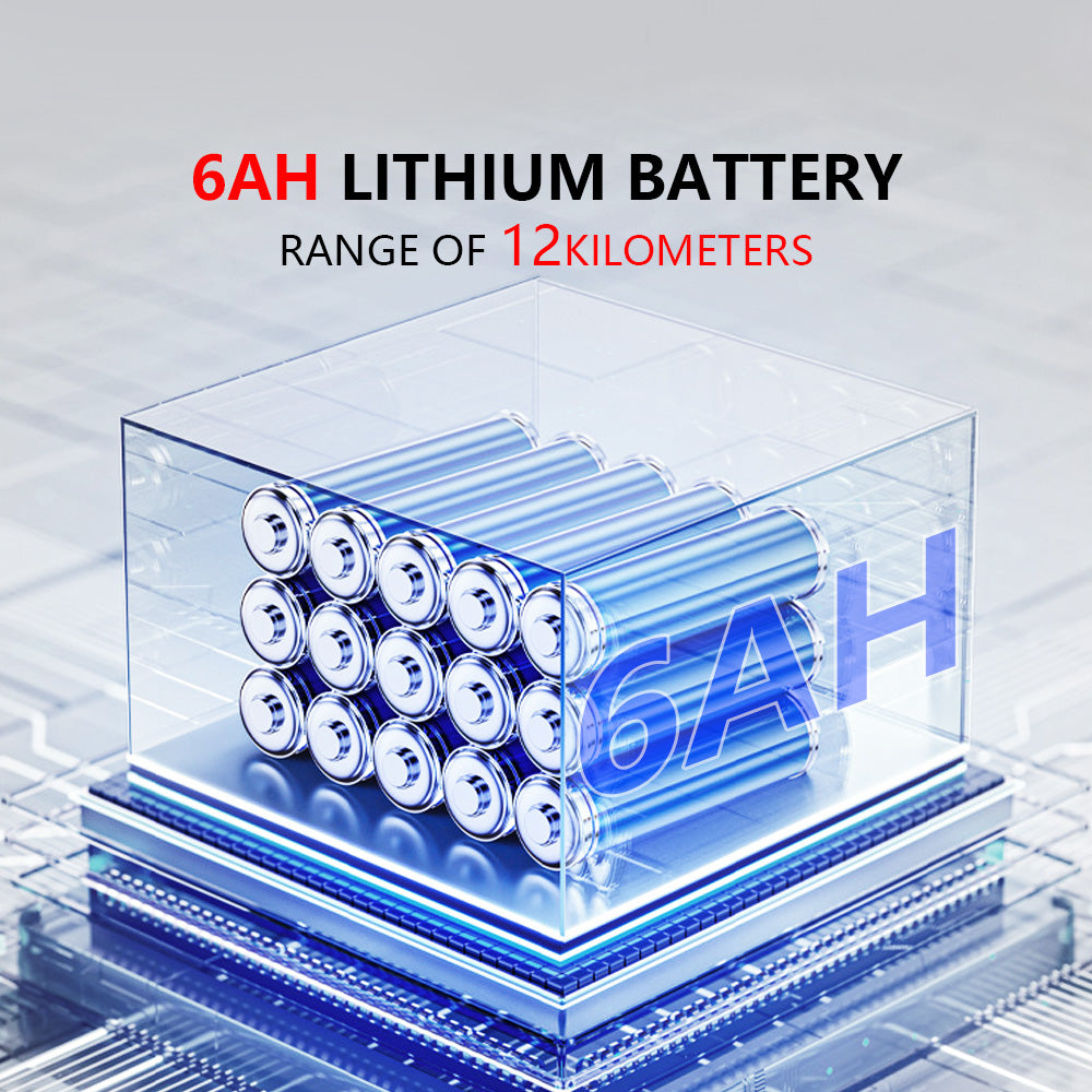 Battery & Range: 24 V 6 Ah lithium battery offering up to 12 km range per charge.
