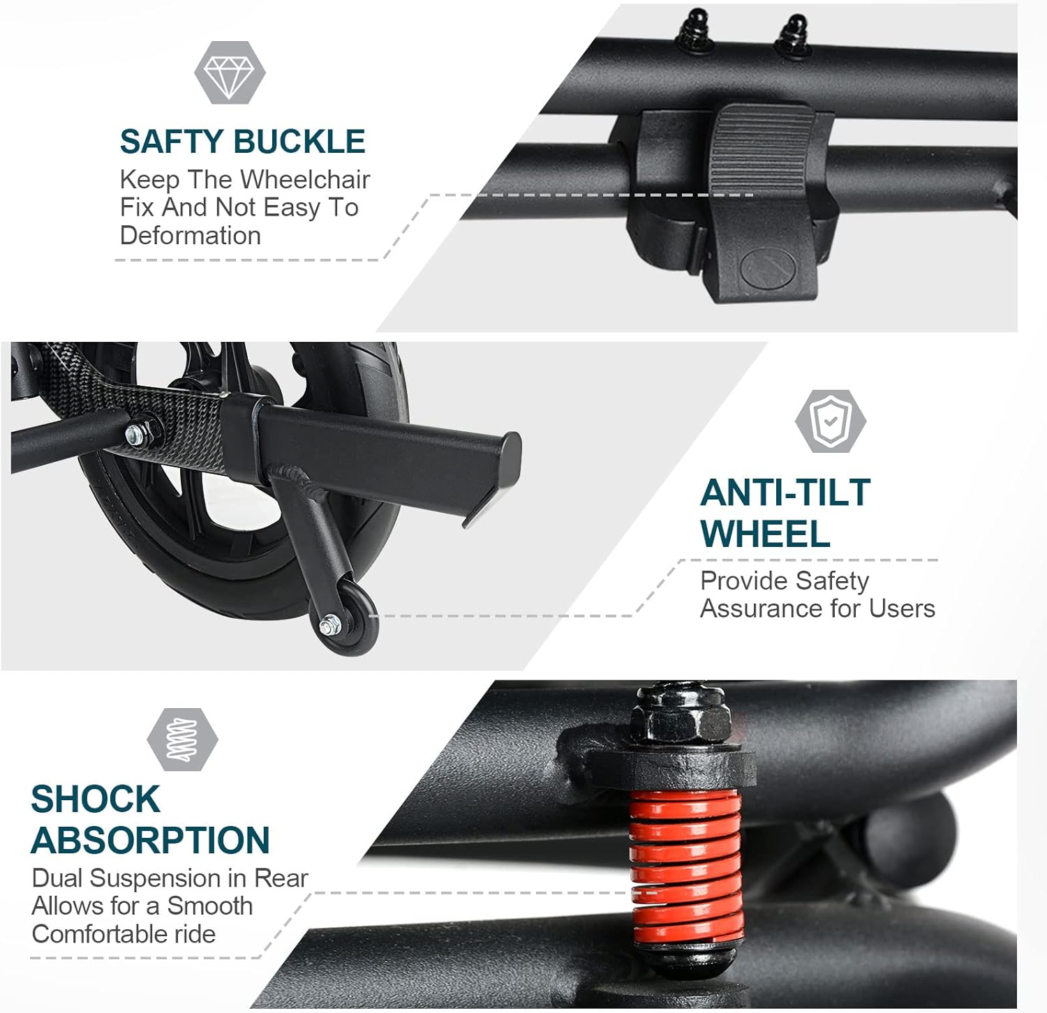 Safety First: Anti-tip wheels prevent falling when reclining or going over curbs.